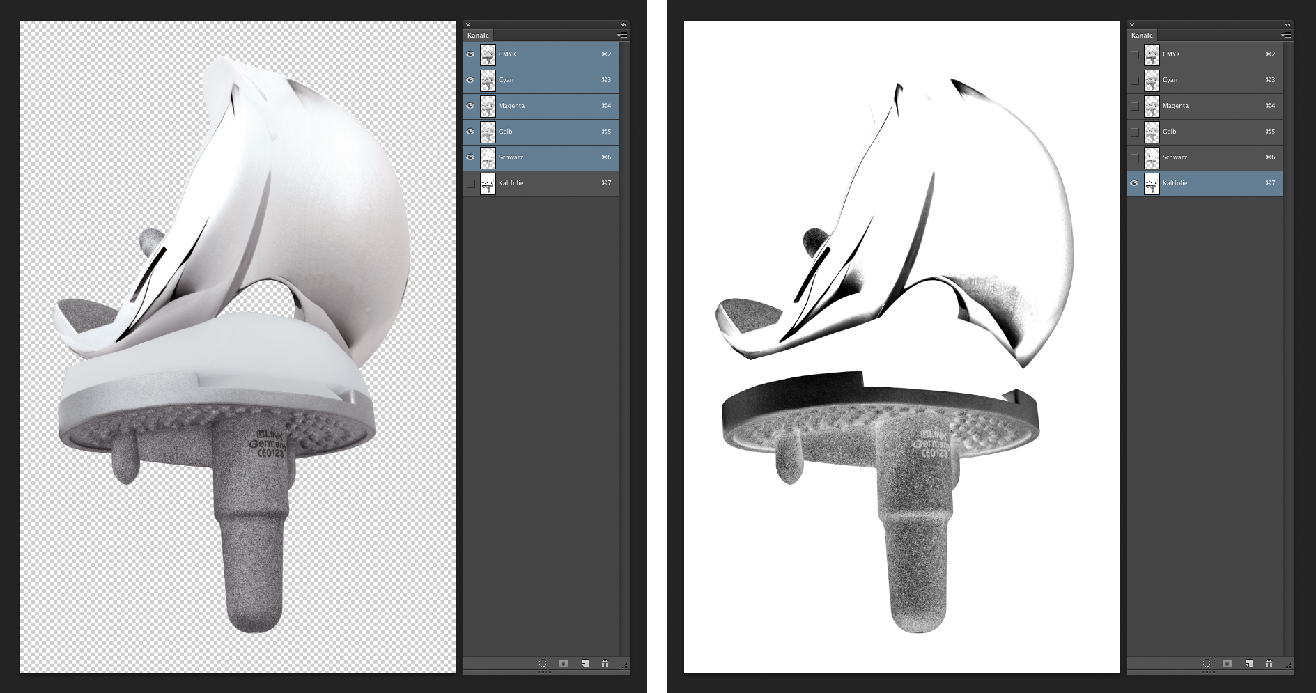 Der wichtigste Teil der Druckdaten ist in diesem Fall die Ebene der Silberfolie. Durch verschiedene Projekte haben wir bereits viele Erfahrungen gesammelt, um optimale Ergebnisse zu liefern. Das „einfache“ Hinterlegen des gesamten Objektes führt zwar zur einem glänzenden Endergebnis, jedoch bleibt ein realistischer, metallischer Effekt aus. Gut kann man sich eine silberne Thermoskanne vorstellen, die beim Anschauen nicht überall glänzt, sondern das Licht nur in bestimmten Bereichen mehr oder weniger stark reflektiert.